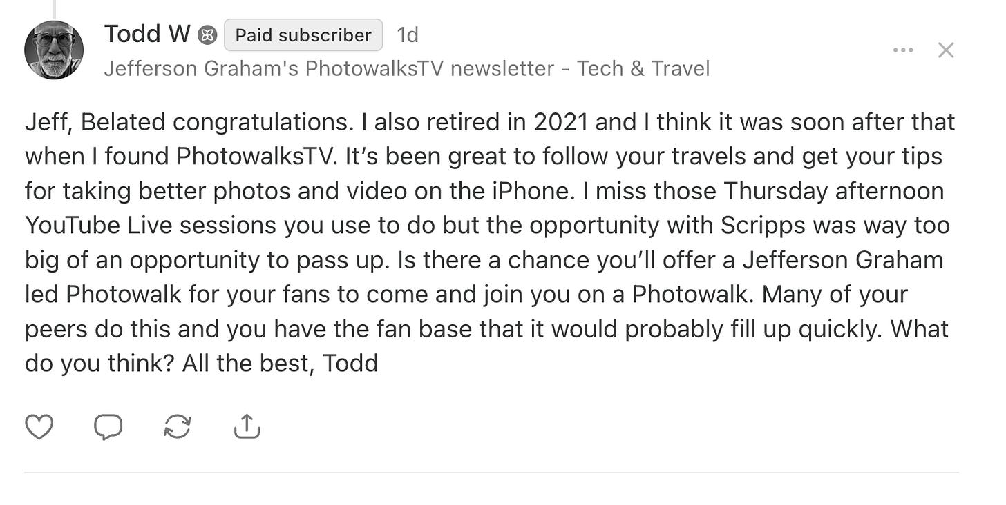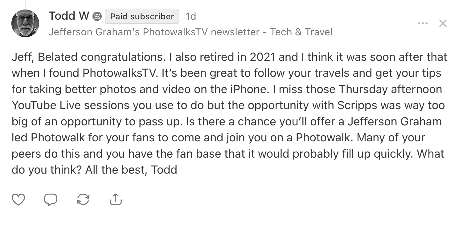 “Is there a chance you’ll offer a Jefferson Graham led Photowalk for your fans to come and join you on a Photowalk? Many of your peers do this and you have the fan base that it would probably fill up quickly. What do you think? “