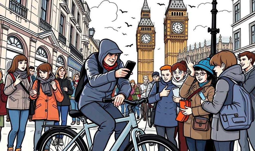 Recap: Over 100,000 phones are stolen from tourists yearly in London, mostly unaware folks who walk down the street texting or following online maps, only to get their phones snatched out of their hands by thieves on fast moving e-bikes and scooters.
