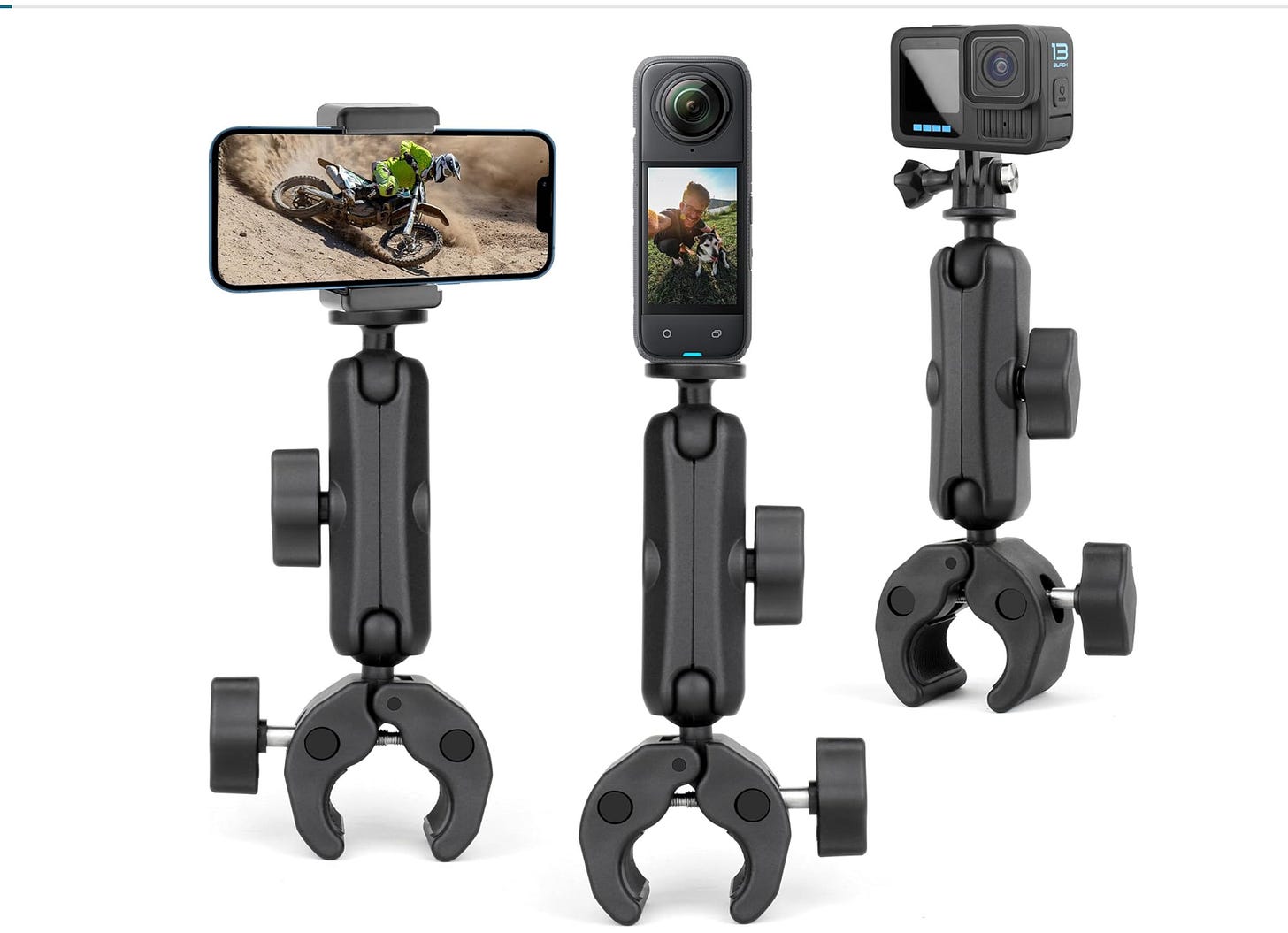For clamps, I found this model on Amazon for $25, and not only should it work for you, but you can use the iPhone, GoPro, Insta360 or DJI’s popular Osmo 3 mini camera.
