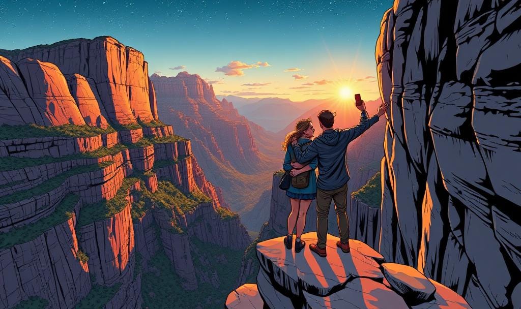 AI generated art of a couple taking a selfie on a cliff in a national park